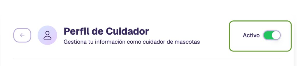 Antes de guardar los cambios, es importante que actives tu perfil haciendo click en el botón que dice «Inactivo» para cambiarlo al estado «Activo«. Esto hace que tu perfil sea visible para los dueños de mascotas que están buscando cuidadores.