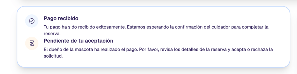 ⚠️ Importante: realizar el pago no significa que la reserva esté confirmada. En este momento tu reserva pasa al estado «pendiente». Esto quiere decir que el cuidador todavía tiene que revisar los detalles y aceptar el servicio. Vas a recibir un email avisándote que tu reserva está pendiente de confirmación por parte del cuidador.