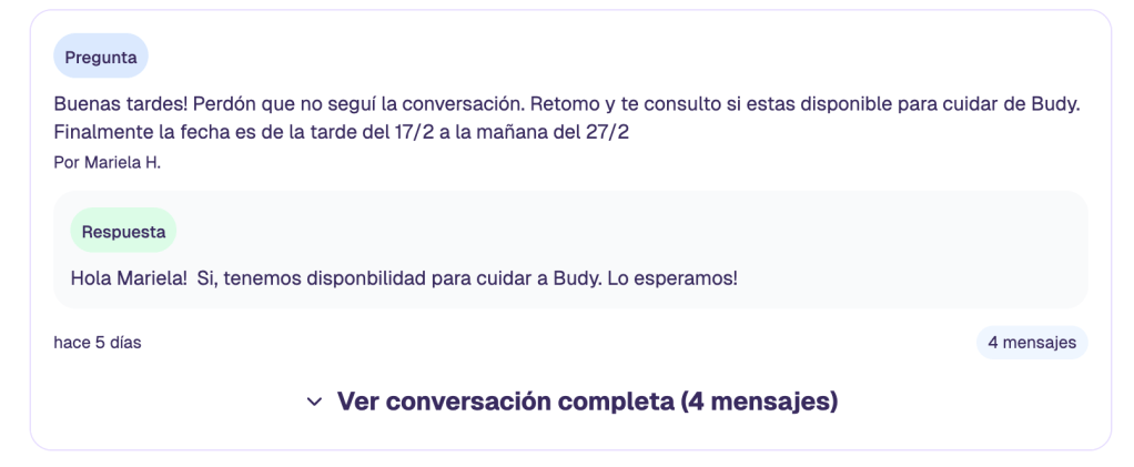 ⚠️ Atención: las consultas previas a la reserva están pensadas para resolver dudas sobre el cuidado, no para intercambiar datos personales. No está permitido compartir teléfono, WhatsApp, email ni ningún otro dato de contacto a través de este canal. Esta medida existe para protegerte a vos y al cuidador. No podemos respaldarte ante un incumplimiento si no está la reserva hecha dentro de la plataforma. Una vez que la reserva esté aceptada, ambos van a recibir por email toda la información de contacto necesaria para coordinar el cuidado.