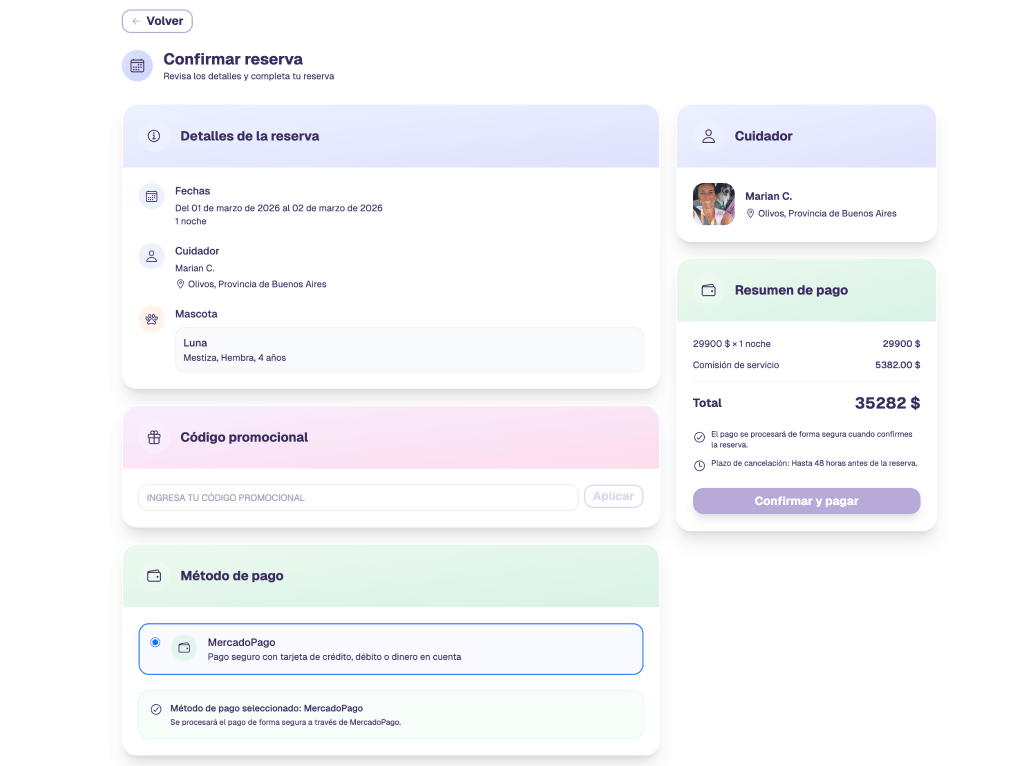 Antes de confirmar, vas a ver una pantalla de checkout con el resumen completo de tu reserva: las fechas, los datos de tu mascota, el cuidador seleccionado y el monto total.