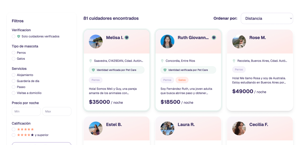Desde la plataforma podés buscar cuidadores filtrando por zona, distancia y tipo de mascota (perro o gato). Esto te permite encontrar opciones cercanas y que se adapten a lo que tu mascota necesita.