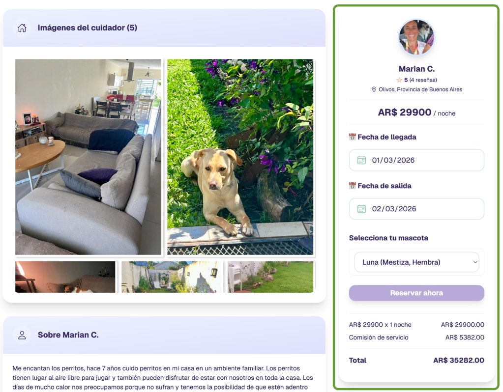 Cada perfil incluye fotos del espacio donde se quedaría tu mascota, una descripción del cuidador, su experiencia, los servicios que ofrece y las reseñas de otros tutores. Tomarte el tiempo para leer con calma cada perfil es parte del proceso: la tranquilidad empieza antes de la reserva.