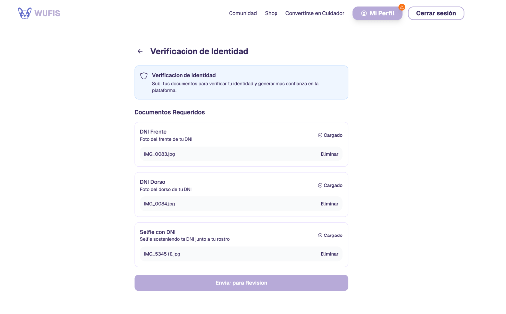Vas a ver un mensaje que dice «En Revisión» junto con el detalle: «Tus documentos están siendo revisados. Te notificaremos cuando tengamos una respuesta.» Este estado también aparece en tu panel de Mi Perfil, en la sección de Documentos de Identificación.